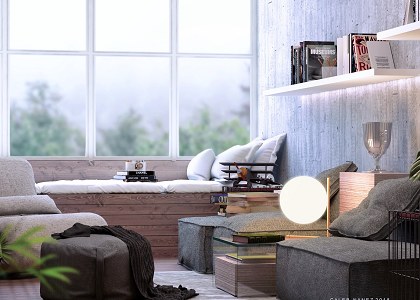 A simple interior scene with a concept of monotonous approach on colours intended for a calm, tranquil and serene blend to natural lighting. Adaptively large windows to maximise outdoor view and enhance multitask indoors.