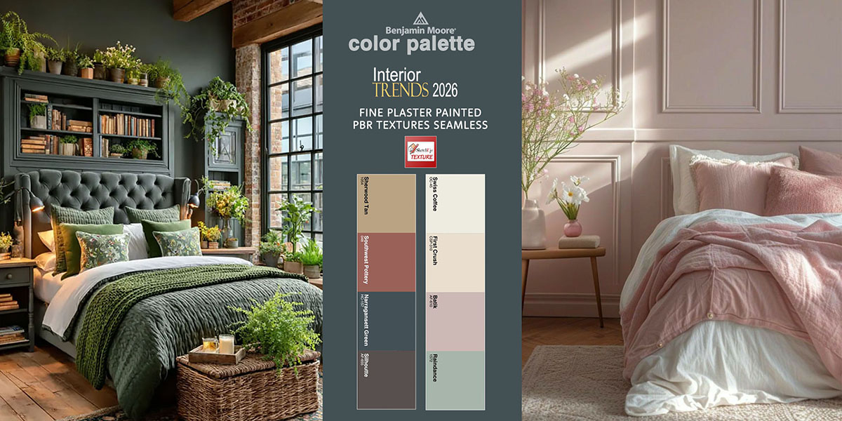 Alongside this palette, we have also developed plaster seamless textures with more traditional finishes, designed for softer and more delicate environments, inspired by the color trends proposed by Benjamin Moore. Long regarded as a trusted reference in the industry, the brand bases its annual palettes on extensive research, offering color solutions appreciated by architects and designers worldwide.