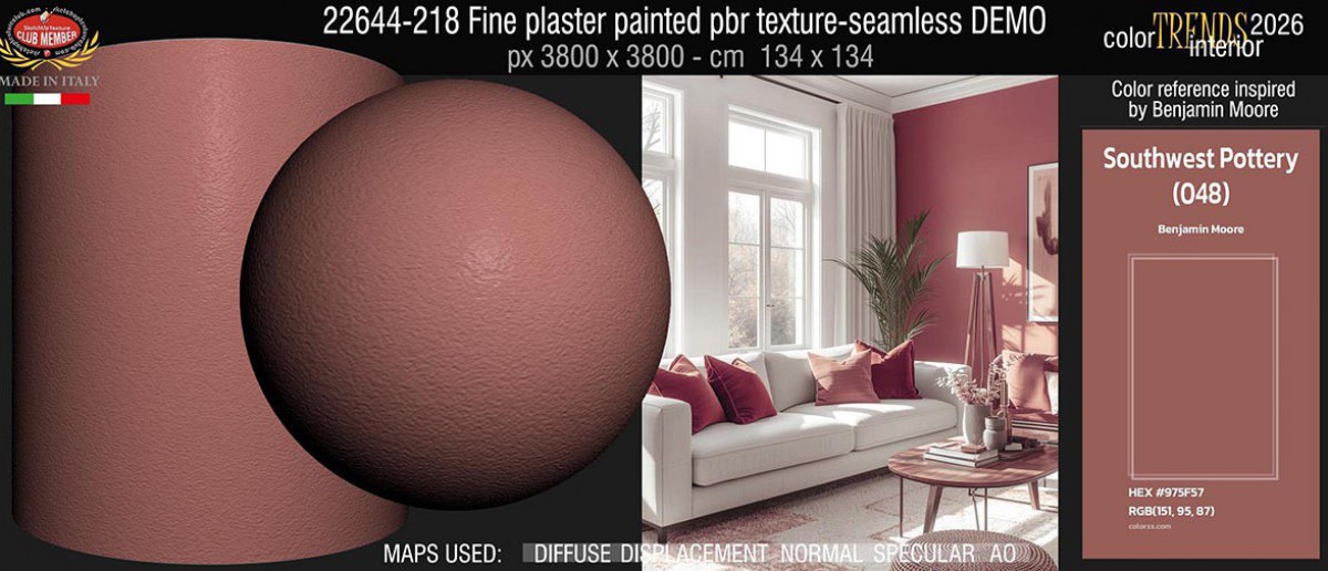 Our goal is to support architects and designers by providing finishes that align with contemporary interior design needs. From this perspective, we developed a series of clay-based plaster textures seamless, inspired by the remarkable production of Matteo Brioni. His palette, composed of carefully selected natural hues, represents one of the most significant expressions of 2026 trends, allowing the creation of spaces that combine the authentic charm of traditional rural architecture with modern, minimalist elements.